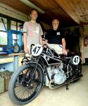 Sedmadevadesátiletý bavorák z roku 1928 poprvé po renovaci na dráze - a jednaosmdesátiletý Petr Hošťálek (1943) poprvé po 64 letech zas za jeho řidítky.